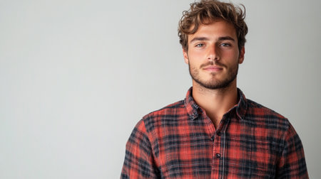 Portrait of a handsome young man with curly hair in a checkered shirt