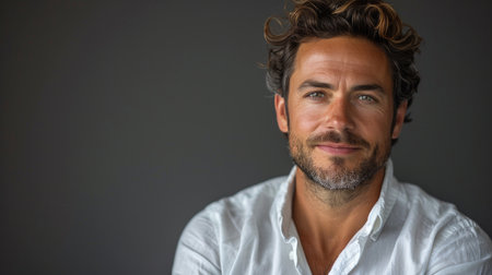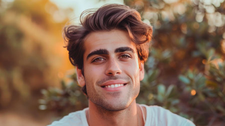 A Stylish man with trendy haircut and blue eyes, smiling confidently