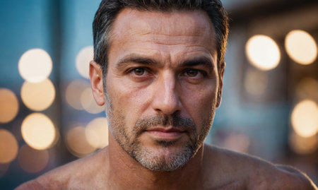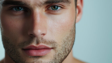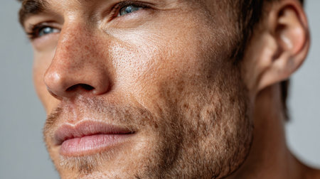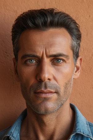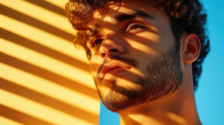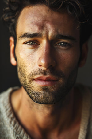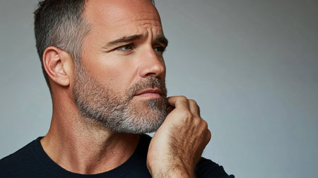 A confident man showcases enhanced facial features, exuding admiration and reflection in his thoughtful gaze. Perfect for themes of self-assurance and charisma.