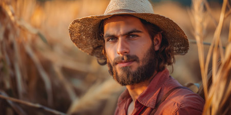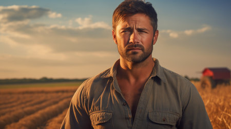 Portrait of a handsome farmer standing in a wheat field at sunset