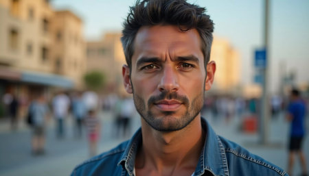 A striking young man stands confidently in the heart of Gaza, embodying strength amidst the bustling streets filled with people and local activity during the golden hour.