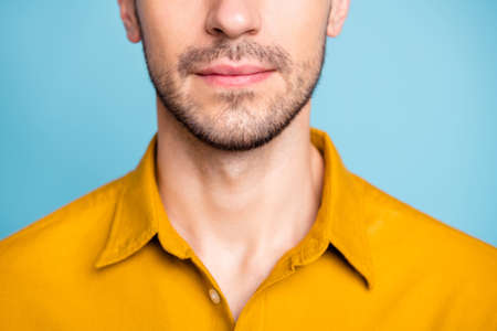 Close-up cropped view portrait of nice attractive virile content well-groomed guy after modern salon procedure styling isolated on bright, vivid shine vibrant blue green turquoise color background