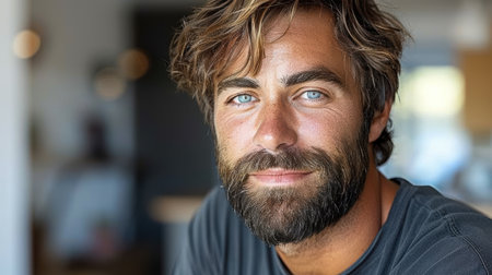A close up of man with rugged beard and striking blue eyes, exuding confidence