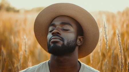 A man stands in a golden wheat field, eyes closed and face relaxed as the sun sets, creating a tranquil atmosphere. His stylish hat complements his calm demeanor.