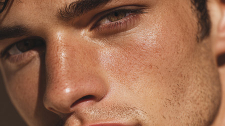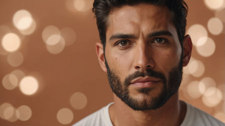 AI Generated. Handsome South American Man s Face Showcased in Cosmetic Advertising Banner on Peach Background