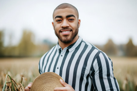 A farmer with a warm smile stands in a dewy field at dawn, holding a straw hat and celebrating sustainable agriculture amidst golden crops.