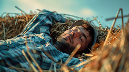 Tired farmer lying on a haystack, AI generated Image