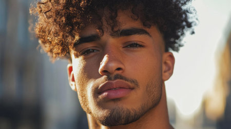 This captivating close-up portrait features a young man with striking features and a natural glow, showcasing his warm skin tone and expressive eyes.