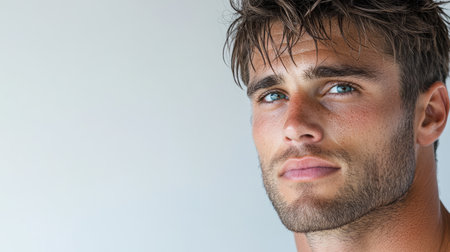 A young man gazes intently, showing his vivid blue eyes and a slight stubble. The soft background accentuates his facial features and natural beauty.