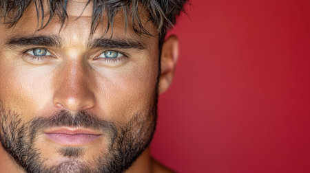 A Confident man with striking blue eyes and strong jawline against red background