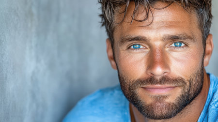A charming man with tousled hair and striking blue eyes poses confidently