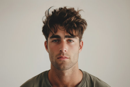 A young man from Russia gazes directly at the viewer with striking blue eyes. Tousled hair and relaxed expression. Introspection and tranquility. Portrait of a handsome man of 30 years. Generative AI.