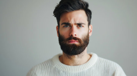Serious bearded man in white sweater looking at camera with determined expression on face
