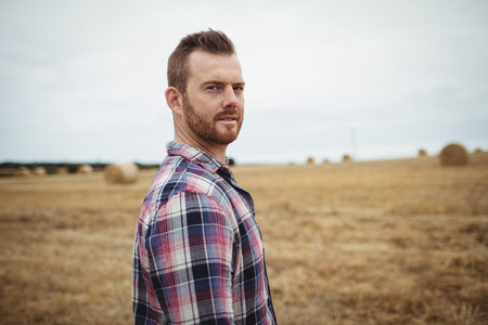Portrait of handsome man with beard looking at camera in the countryside