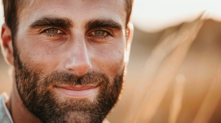 A striking close-up portrait highlighting a man's blue eyes and well-groomed facial hair. The image captures natural expressions, skin texture, and personality.