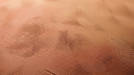 Macro view of fingerprint patterns pressed into a textured, earthy clay surface. Clear details and vibrant col...
