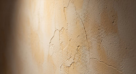 A close-up, angled view of a textured beige plaster wall revealing subtle color variations, cracks, and an uneven, organic surface.