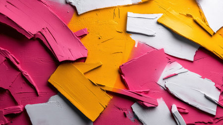 Close-up of abstract art featuring thick, textured paint strokes in pink, yellow, and white, creating a dynamic composition.