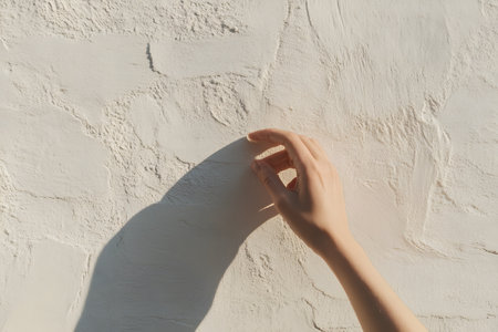 A human hand gently touches a rough, textured white wall under harsh sunlight, casting a prominent shadow. The image focuses on tactile sensation and rustic textures.