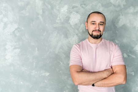 Young handsome man with a beard is smiling. Serious man folded his arms over his chest