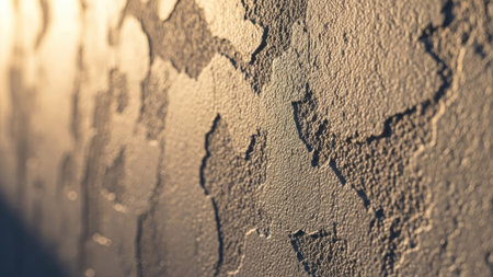 This image showcases a close-up of a wall with a distressed surface, featuring peeling paint and a rough texture. The color palette consists of warm tones with shadows and highlights. The composition uses depth of field to draw attention to the texture. It could be used for backgrounds or illustrating concepts related to aging or design.