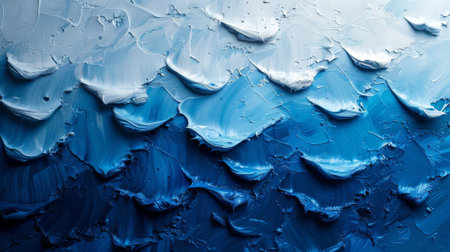 Detailed view of blue paint with smooth, layered strokes and textured patterns, showcasing an abstract and creative artistic design.