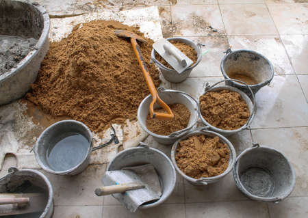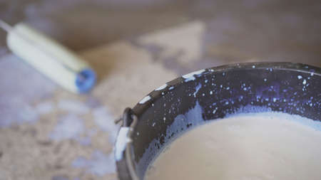 The concept of repair of the house and premises. Buckets of paint and lime for whitewashing and painting walls. A real non-staged scene while working.