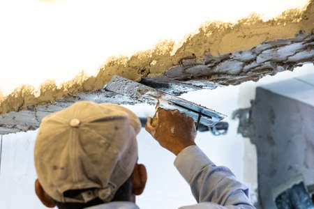 Worker plastering cement mortar on concrete ceiling beam with trowel