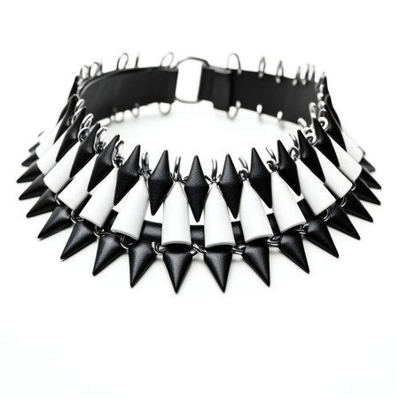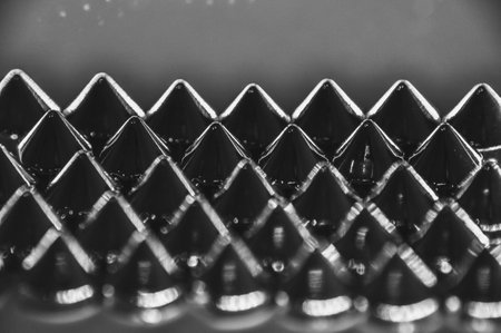 a row of spikes and rods is captured in a close-up view, showcasing a minimalist black and white style with a sleek metallic finish. the image resembles digital airbrushing, featuring playful still-lifes and explosive pigmentation. tilt-shift lenses are used to create a unique perspective, while tagging-like marks add an edgy touch to the composition. ai generated