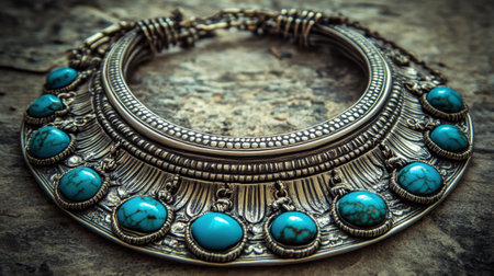 This stunning vintage silver necklace features intricate craftsmanship with vibrant turquoise gems. Perfect for adding elegance to any outfit.