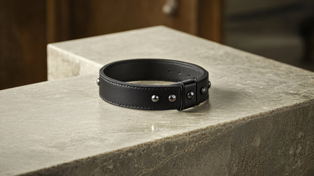 A single leather cuff bracelet with metal rivets arranged on a light gray stone surface, offering a rugged and modern feel.