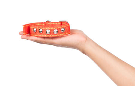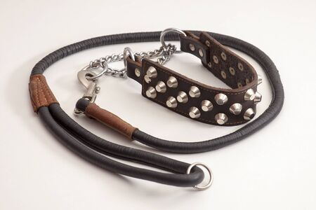 Dog collar from brown leather with metal rivets, black and ginger leash, carabiner fastened . Close up on white background, copy space. Ammunition for big pet animal.