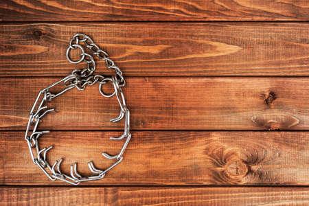 metal pinch collar for dogs lying on a brown wooden table background. Photo.