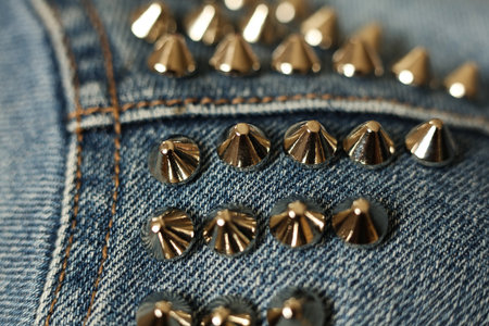Jeans close-up. Details of a denim jacket with silver spikes. Selective focus.