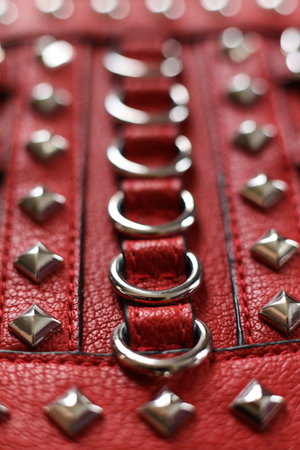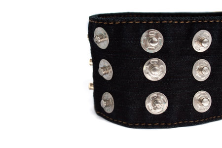 Macro picture of black jeans belt with many buttons isolated on a white background, copy space. Rock music, alternative punk fashion.