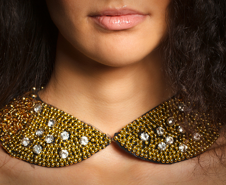 This image showcases a close-up of an ornate collar featuring intricate embroidery and jewel embellishments on a traditional garment, highlighting craftsmanship.