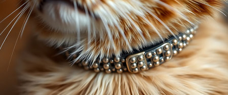A close-up macro shot captures the quiet elegance of a domestic cat. Bathed in the warm glow of morning sunlight, its jeweled collar and tiny bell glint, hinting at a cherished and pampered life. The soft focus creates a dreamy, affectionate mood.