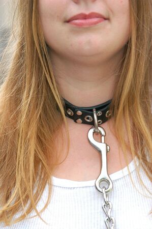 dog collar with spikes on a long metal chain on a turquoise background. 3D rendering.
