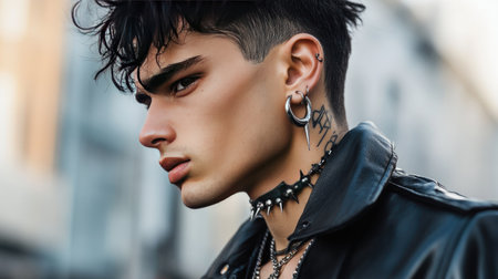 A man showcasing bold ear piercings with thick hoops and spikes, styled with an edgy leather jacket.