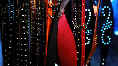 Various animal collars displayed on rack with studs and embellishments, including black, brown, red, and blue collars hanging side by side for visibility and selection