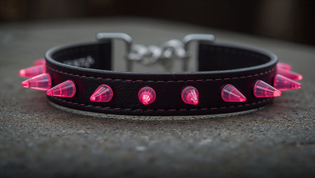 A close-up of a black leather dog collar adorned with bright pink conical spikes. The bold neon spikes create an edgy, fashion-forward mood, ideal for pet accessory catalogs and lifestyle campaigns. Perfect for product photography and advertising.