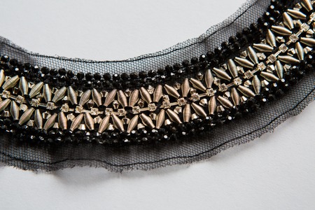black fabric pieces with beads and Paillette lace, design dresses, clothing for celebrations on white background