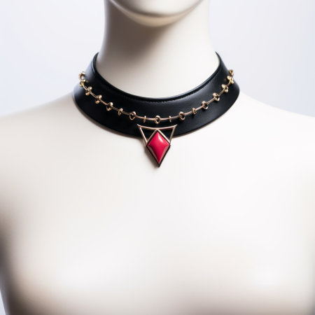the choker necklace features a striking red diamond, designed with a combination of light gold and dark black elements. created by cristina mcallister, this leatherhide accessory showcases a beautiful contrast between dark pink and light indigo shades. the high-definition image captures the choker's intricate details, enhanced by volumetric lighting and a balanced asymmetry. ai generated