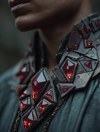Detailed close-up of a man showcasing exquisite formal attire with stunning embroidery and a unique necklace, perfect for upscale events and cultural ceremonies.