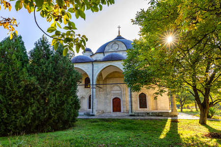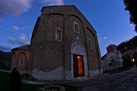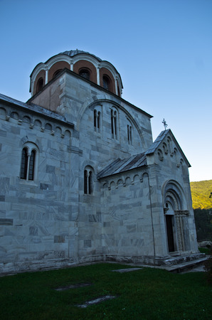 White marble church from 12. century inside Studenica monastery at sunset, UNESCO world heritage site in Serbia