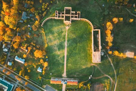 Ruzhany, Brest Region, Belarus. Cityscape Skyline In Autumn Sunny Evening. Birds-eye View Of Ruzhany Palace. Famous Popular Historic Landmark