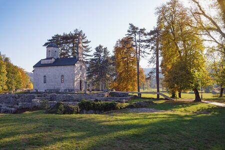 Sunny autumn day. Montenegro, Cetinje town. Church of Birth of Our Lady ( Court Church on Cipur )