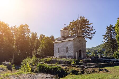 Moraca Monastery, a Serbian Orthodox church in Kolasin, Montenegro. Ancient religious building and graveyard.