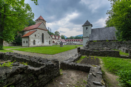 Scenic view of Cerveny Klastor monastery with church, bell tower, and ruins, located in Presovsky kraj, Slovakia