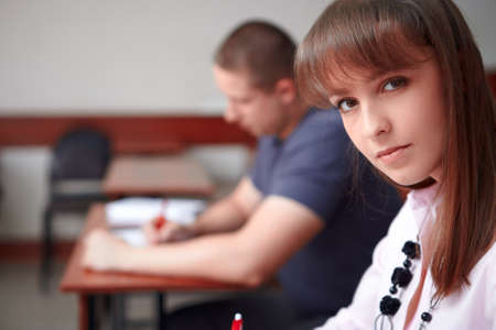 Students writing and reading exam answer sheets exercises in classroom of school with stress